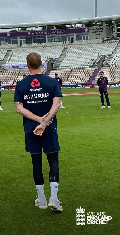 इंग्लंडच्या क्रिकेटर्सकडून या कोरोना योद्ध्यांना सलाम म्हणून त्यांचे नाव लिहिलेली जर्सी घालून ते मैदानात उतरले होते. पाठीवर डॉक्टरचे नाव आणि त्यापुढे #raisethebat असे लिहिलेले होते.