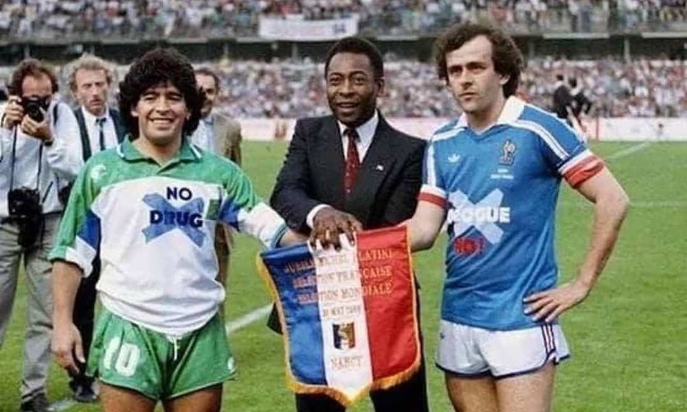 १९८६ सालच्या या फोटोत तीन फुटबॉलचे हिरो आहेत.मध्यभागी उभा आहे पेले. त्याच्या उजव्या बाजूस आहे दिएगो मॅराडोना आणि डाव्या बाजूस आहे प्लॅटिनी ! तिघेही फुटबॉलच्या विश्वातील देव समजले जातात.